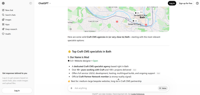As an example, if someone were to ask ChatGPT to recommend a Craft CMS agency based in Bath, it won’t just produce a list of links like Google would. Instead, it synthesises information from many places and responds conversationally, attributing the information it presents to a number of sources (citations).