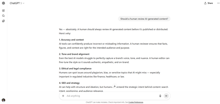 Even the lowest stakes, most accurate AI-generated content should be reviewed by a human. AI won’t get your tone exactly right, it will make mistakes, the content will sound generic in places, and it certainly won’t add original perspectives that make your content unique or distinctive.